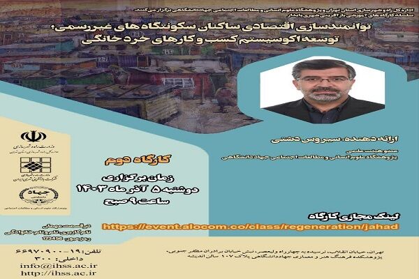 به گزارش پایگاه خبری وزارت راه و شهرسازی (تهران)؛ محمد رضا وفائی نژاد رئیس اداره برنامه ریزی مسکن و بازآفرینی اداره کل راه و شهرسازی استان تهران گفت: دومین کارگاه آموزش آنلاین توانمندسازی اقتصادی ساکنان سکونتگاههای غیر رسمی، توسعه اکوسیستم کسب و کار خرد خانگی با تدریس آقای سیروس دشتی عضو هیات علمی پژوهشگاه علوم انسانی و مطالعات اجتماعی جهاد دانشگاهی روز دوشنبه پنجم آذر ماه جاری ساعت ۹ صبح به آدرس لینک : https//event.alocom.co/class/regeneration/jahad برگزار می شود.