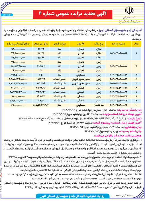 به گزارش پایگاه خبری وزارت راه و شهرسازی (استان البرز)؛ این اداره کل در نظر دارد املاک و اراضی خود با کاربریهای تجاری، فرهنگی، درمانی، مسکونی و محور مجهز شهری از طریق مزایده عمومی به فروش برساند و متقاضیان میتوانند تا تاریخ ۲۱ آذر ماه سال ۱۴۰۳ جهت دریافت اسناد از طریق سامانه تدارکات الکترونیک دولت به نشانی www.setadiran.ir اقدام کنند.